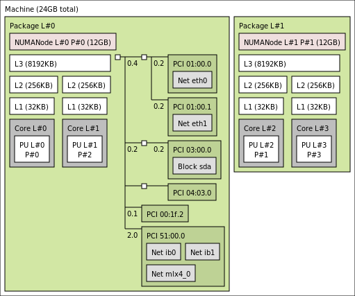 The following picture shows a dual-package dual-core host whose PCI bus is connected to the first package and NUMA node.