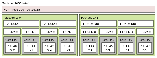 On a 4-package 2-core machine with hyper-threading, the lstopo tool may show the following graphical output: